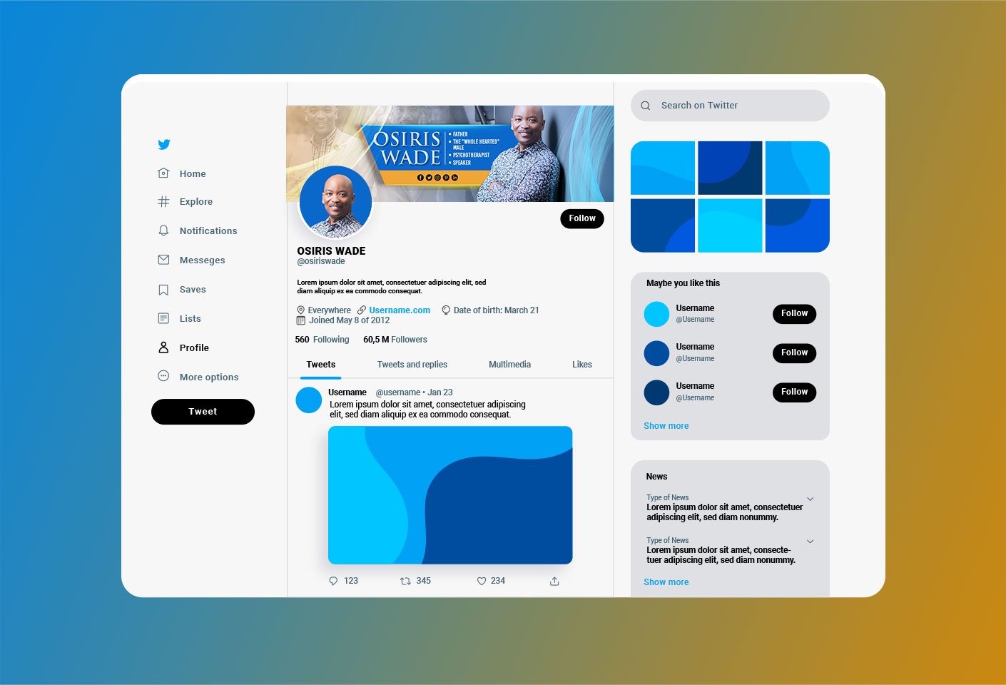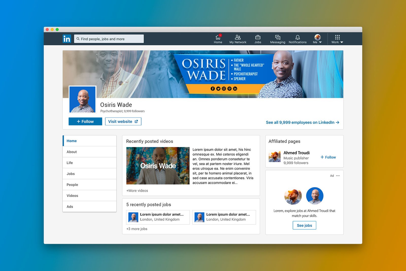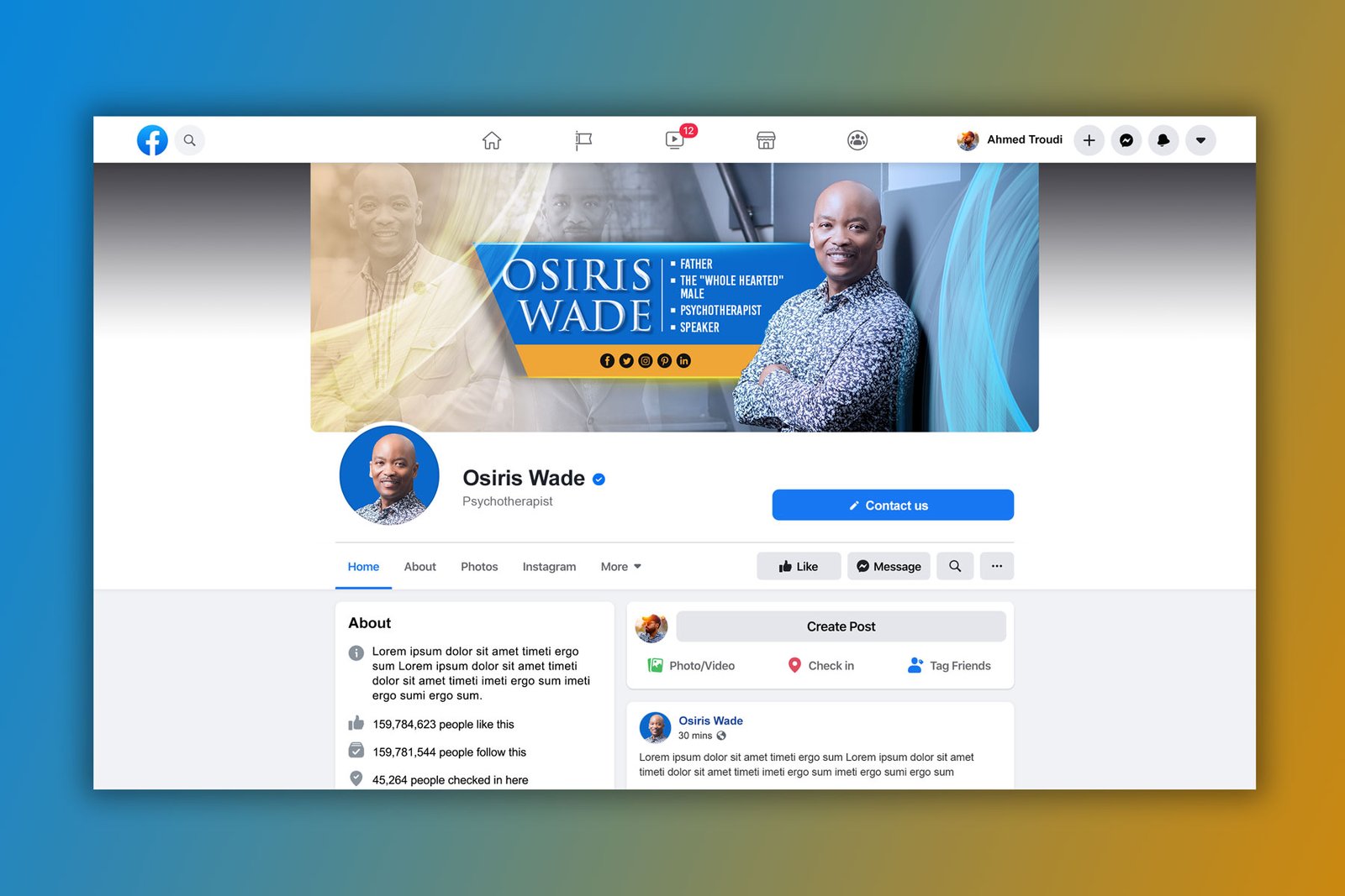For this project, I partnered with Osiris Wade, a psychotherapist, father, and speaker known as The Whole Hearted Male. The goal was to create a cohesive, approachable, and professional social media brand presence across five major platforms — Facebook, Twitter, LinkedIn, Instagram, and Pinterest.
